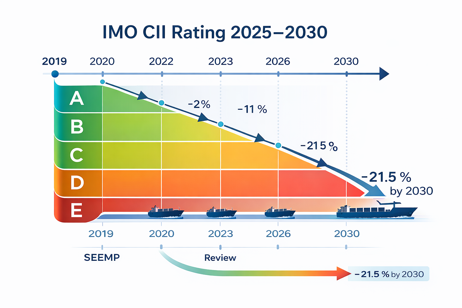 The IMO has created a three-layer compliance framework through the Energy Efficiency Existing Ship Index (EEXI), the Carbon Intensity Indicator (CII) and the Ship Energy Efficiency Management Plan (SEEMP), applicable to all vessels above 5,000 gross tonnes, effectively covering the entire international trading fleet. The CII reduction factors (Z-factors) are clearly defined: 13.625% (2027), 16.25% (2028), 18.875% (2029), and 21.5% (2030), measured against the 2019 baseline (IMO MEPC 82, 2024; IMO MEPC 83, April 2025). Ships rated D or E under CII face port access restrictions and charter value erosion, a risk now actively priced into freight negotiations.
