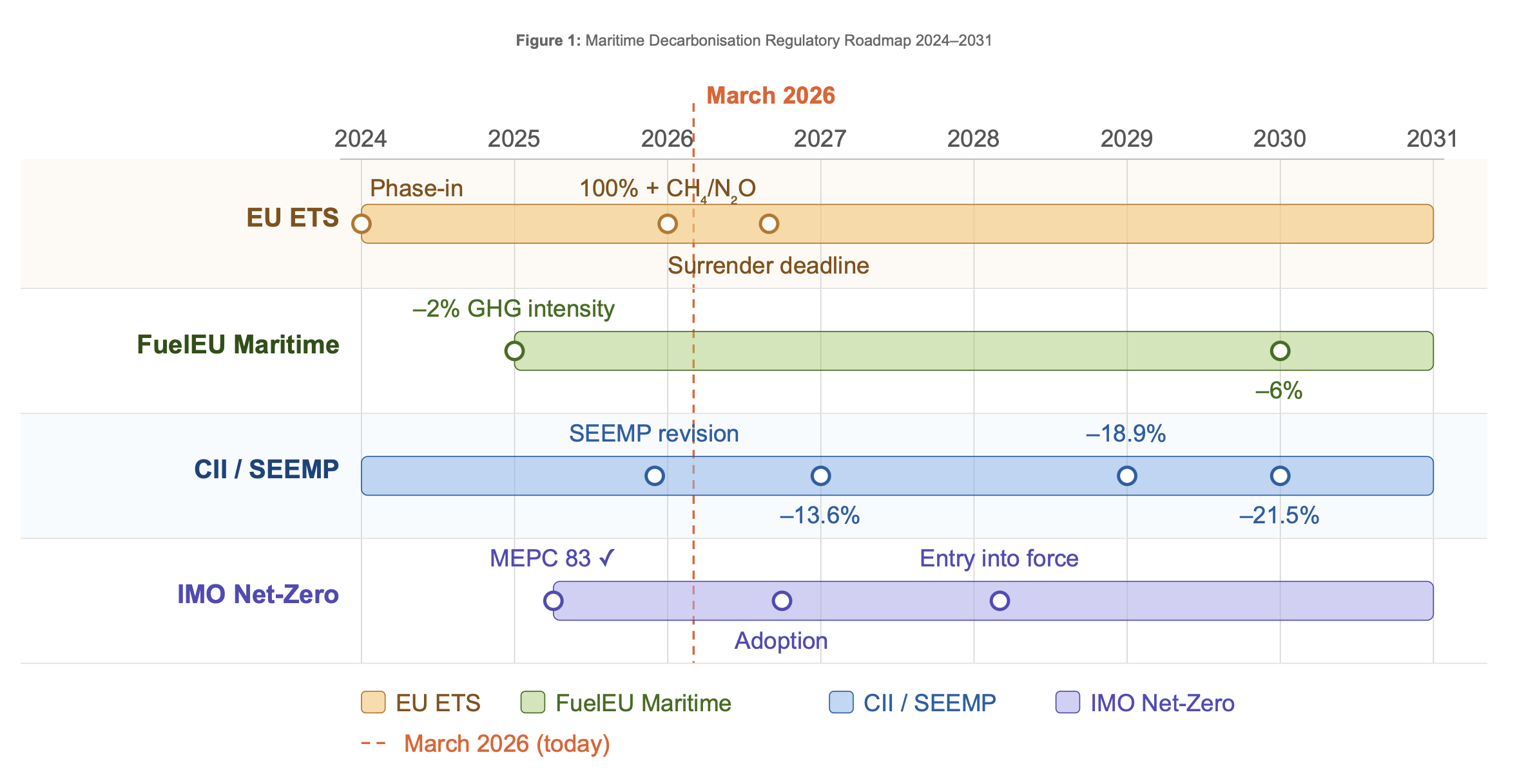 The IMO Net-Zero Framework was approved at MEPC 83 in April 2025, with formal adoption deferred to October 2026 and earliest entry into force in March 2028. This timeline is deceptive, however: shipowners and charterers are already negotiating on the basis of these expectations. Those without an efficiency strategy in place by 2028 face not a regulatory problem but a commercial one.