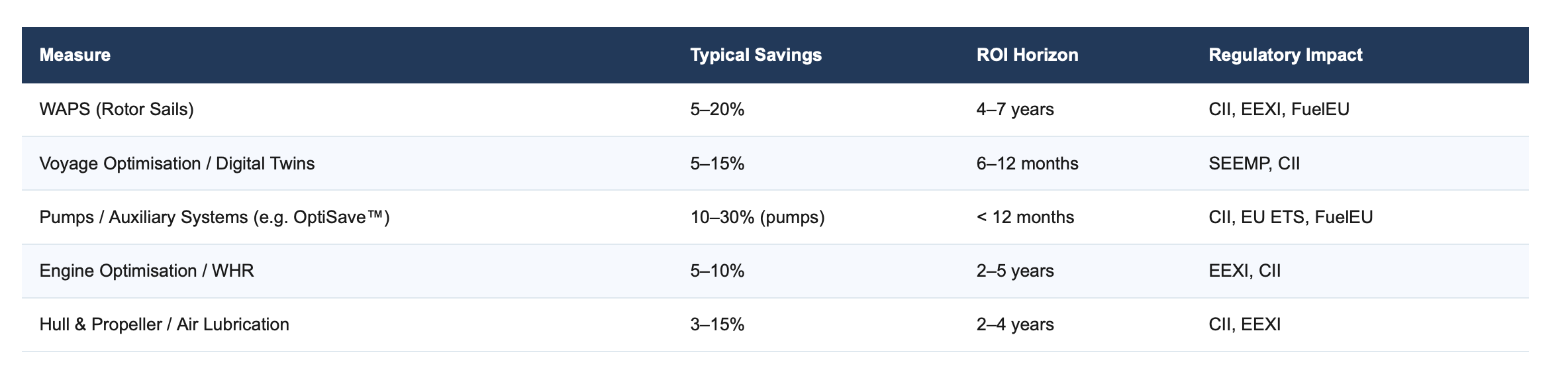 👉 Key Insight: Wind-Assisted Propulsion is no longer a niche technology. Fleets installing rotor sails or wing sails on bulk carriers and tankers today deliver the highest savings per invested euro, and structurally improve their regulatory profile at the same time.