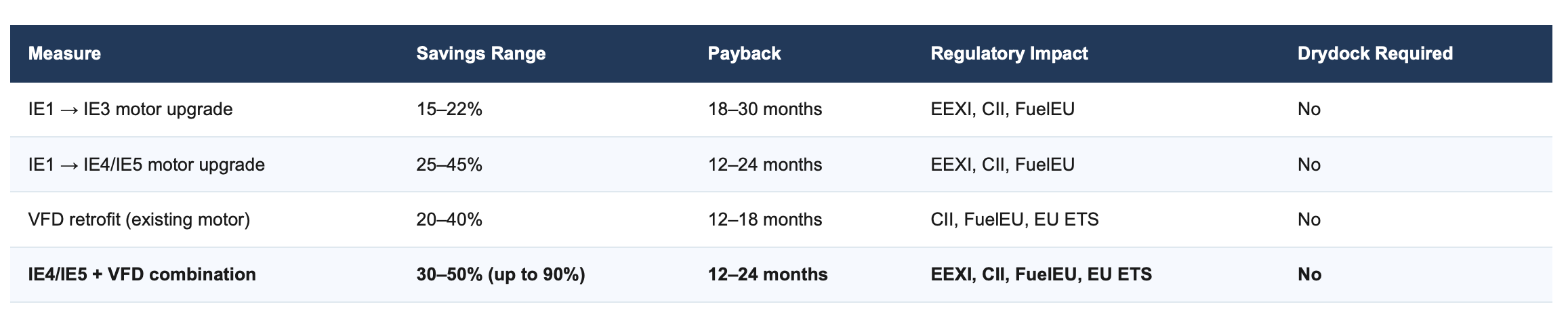 👉 Key Insight: An IE4/IE5 motor alone is a solid improvement. An IE4/IE5 motor with VFD control is a system upgrade with a multiplier effect. The combination delivers the greatest savings where pumps operate in part-load, which is on almost every vessel in normal operations.