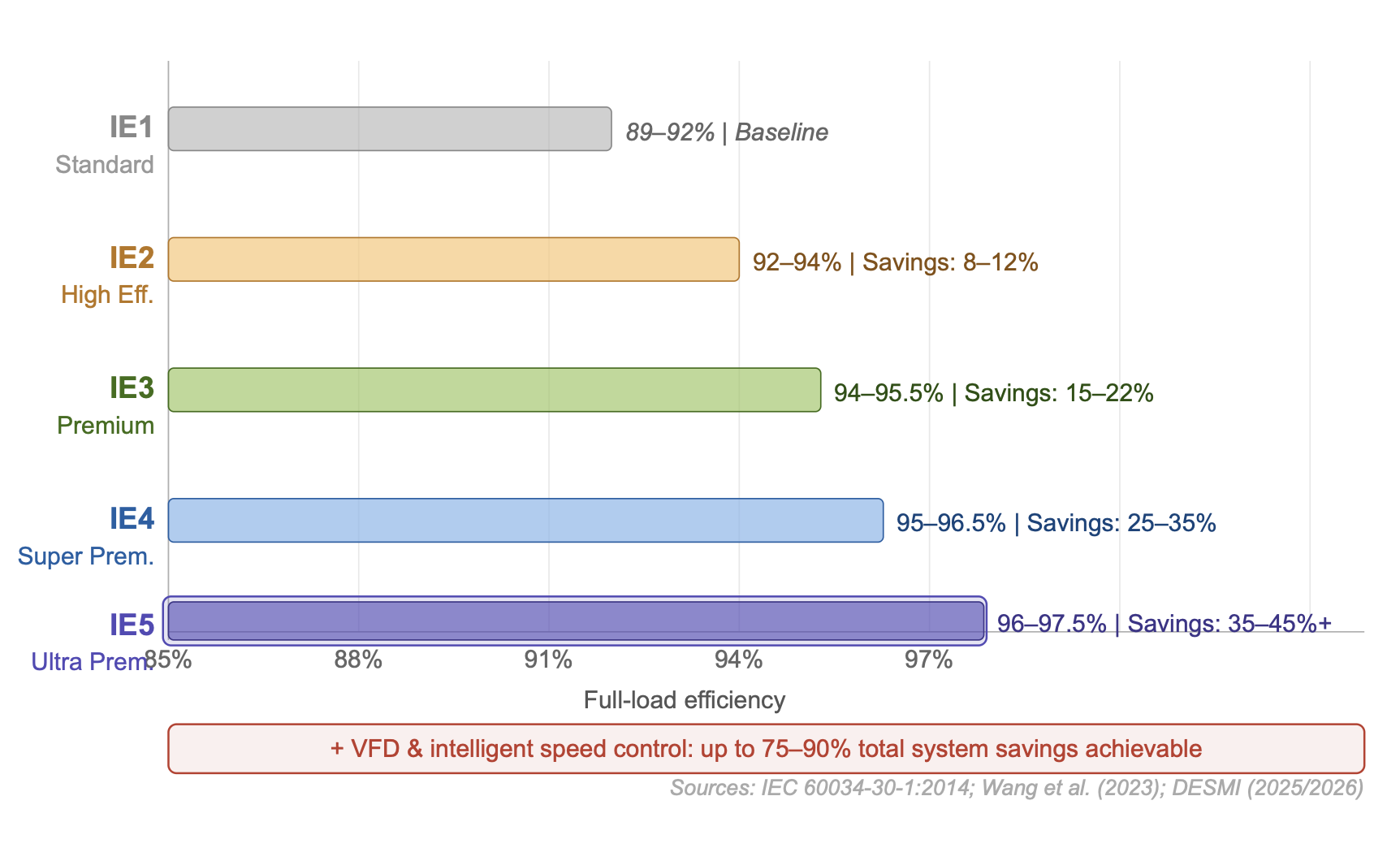 Upgrading from IE1/IE2 to IE4/IE5 motors delivers 2 to 6% higher motor efficiency; combined with Variable Frequency Drives (VFD) and intelligent speed control, 20 to 50% total system savings are realistic, in individual cases up to 75 to 90% for pumps operating far from their best efficiency point (Wang et al., 2023; DESMI, 2025/2026).