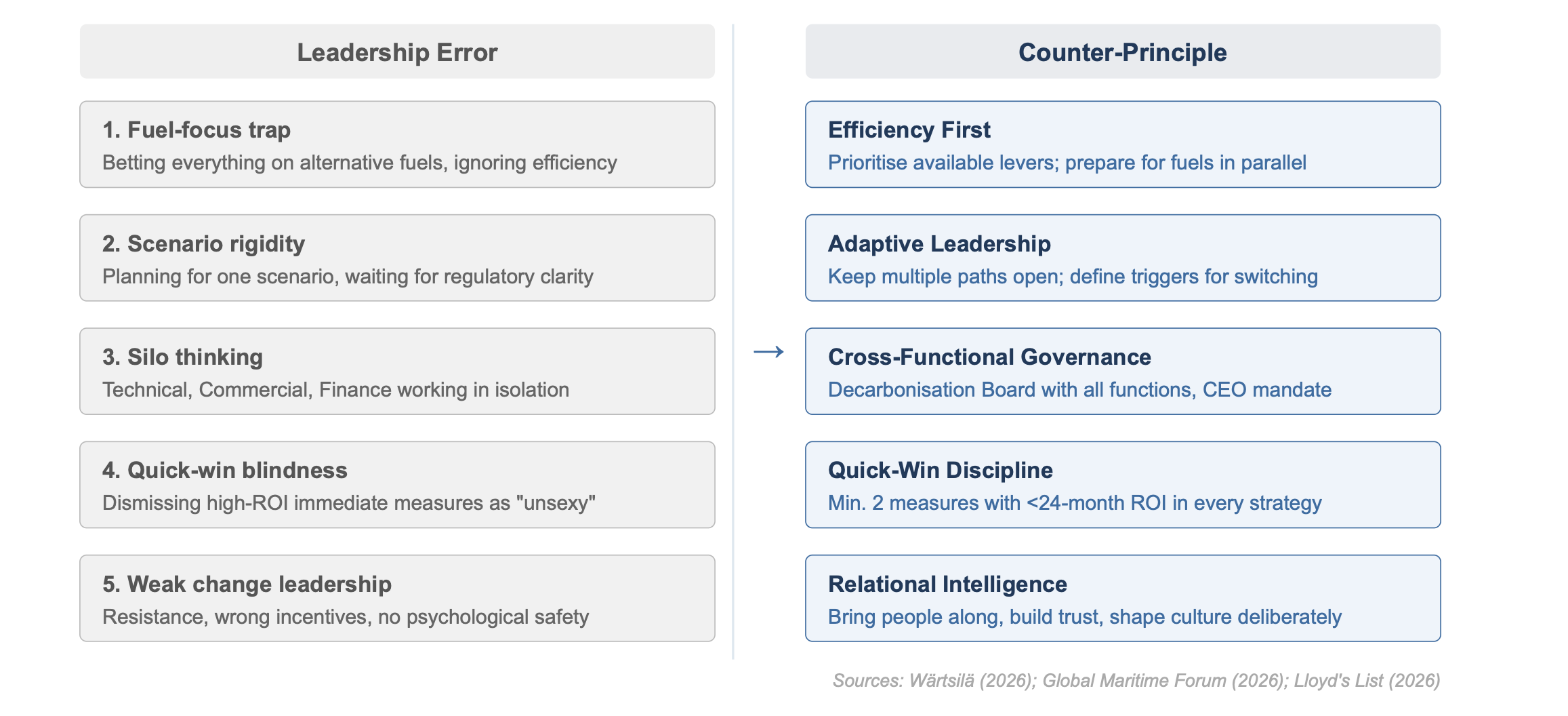 • Five leadership errors systematically explain why decarbonisation strategies fail: overreliance on alternative fuels, lack of scenario flexibility, siloed governance, blindness to immediately available efficiency wins, and weak change leadership.