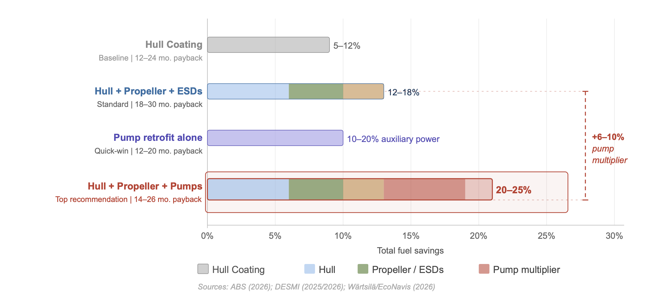 Combining classical drydock measures (hull coating, propeller redesign, ESDs) with pump upgrades (IE4/IE5 + VFD) generates a multiplier effect: instead of 12 to 18%, total savings of 20 to 25% become achievable, at comparable payback periods.