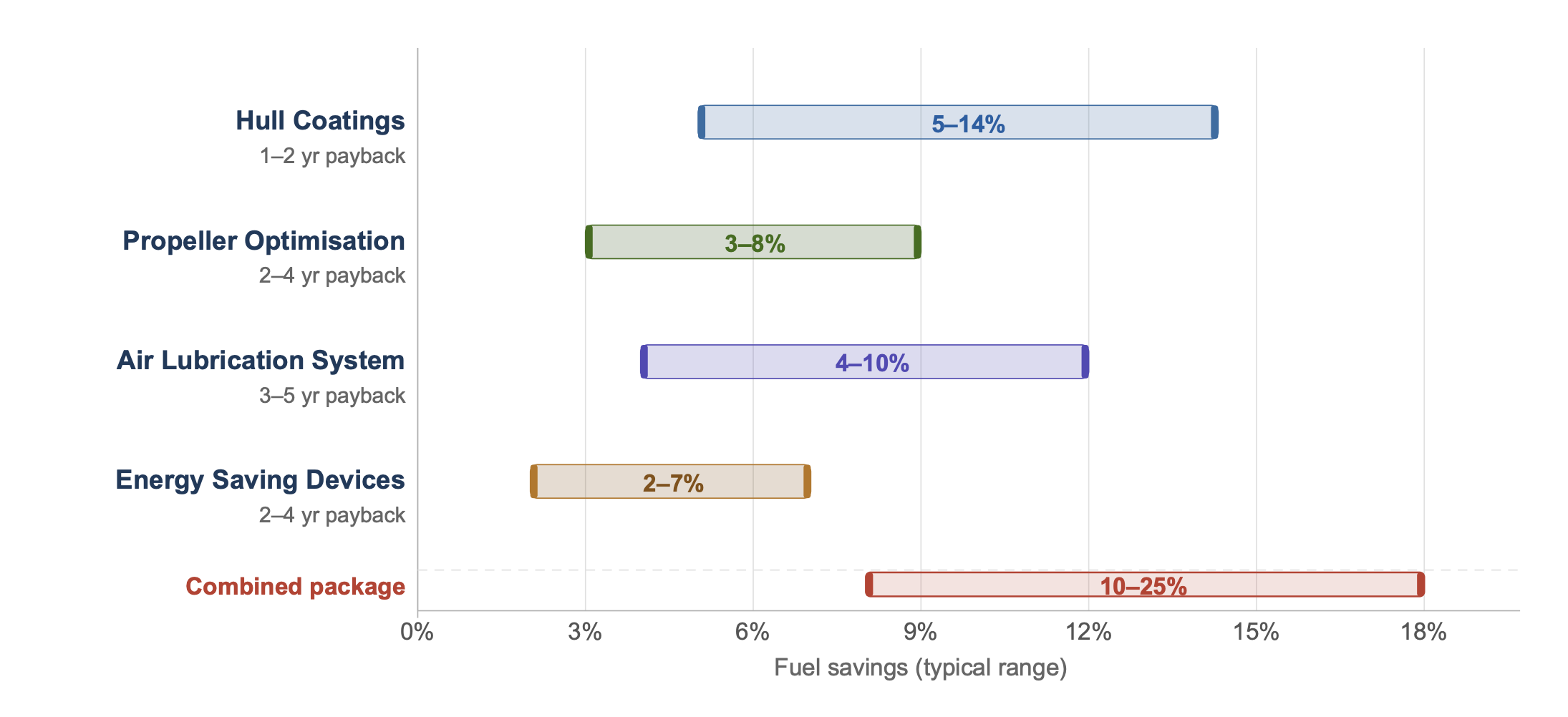 • A complete hardware retrofit in drydock, high-performance coating, propeller optimisation, air lubrication and energy saving devices, delivers 10 to 25% fuel savings across the full docking cycle of 2.5 to 5 years.
