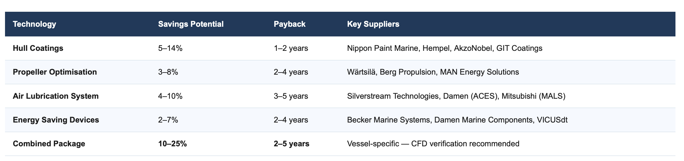 👉 Key Insight: Air lubrication is the technically most compelling complement to the coating-propeller package for flat-bottomed vessels. A payback of 3 to 5 years is solid, and is systematically shortened by CO₂ costs under EU ETS, as ALS directly reduces emissions intensity.