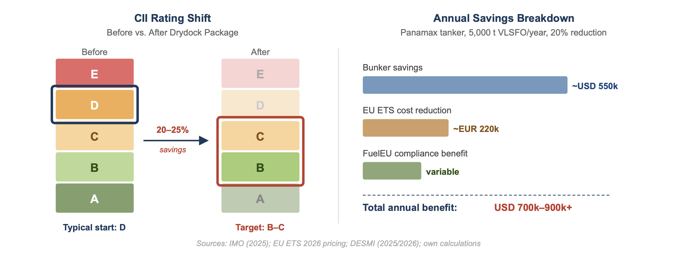Compliance impact of the combined drydock package — CII rating shift and annual EU ETS savings (example: Panamax tanker, 5,000 t VLSFO/year)