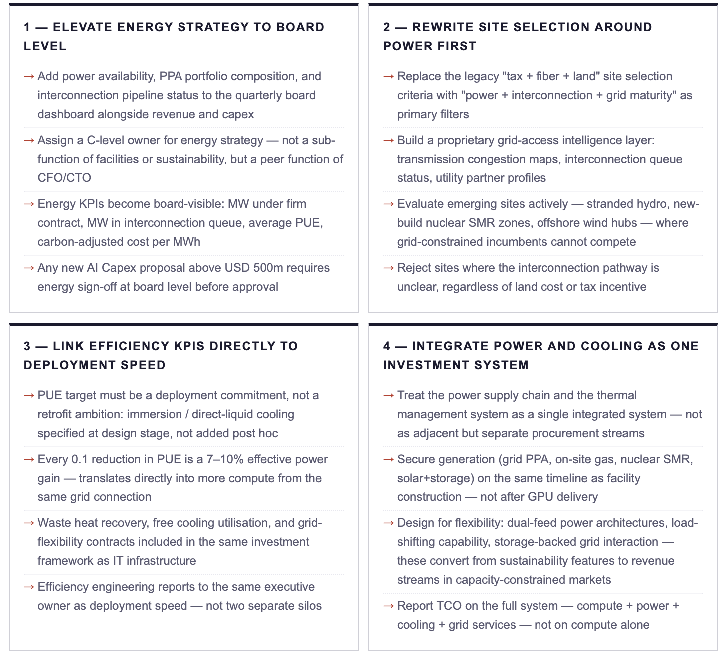 • Establish a dedicated energy strategy function at C-level with authority over site selection, PPA portfolio composition, and interconnection pipeline, reporting directly to the CEO, peer to CFO and CTO.