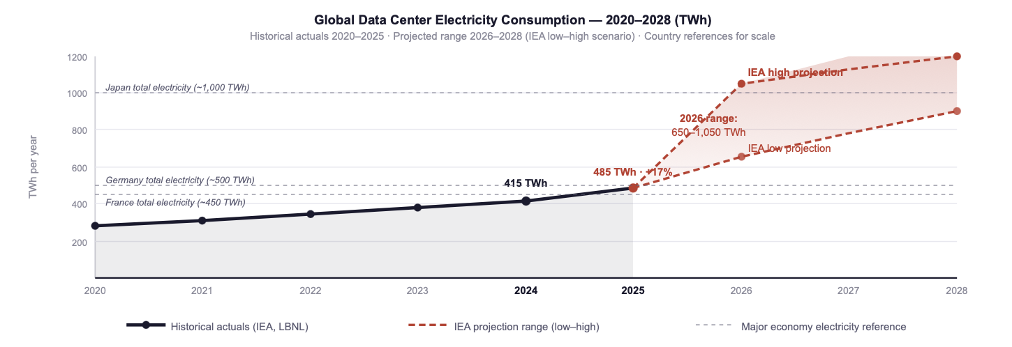 Fig. 1: Global data center electricity consumption 2020–2028. The 2024 actual (415 TWh) already exceeded the entire electricity consumption of France. The IEA high scenario for 2026 (1,050 TWh) exceeds the total electricity consumption of Japan. Sources: IEA Energy and AI Report (2025); IEA "Data centre electricity use surged in 2025" (April 2026); LBNL (2024); own compilation.