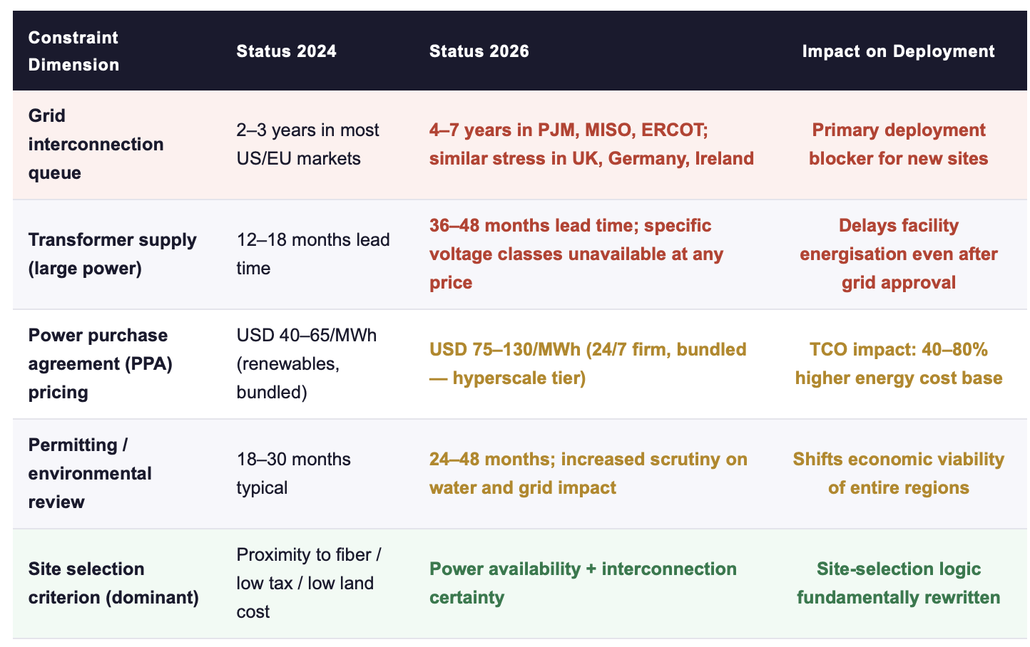 • Capital expenditure by major tech firms exceeded USD 400 billion in 2025, with further growth of roughly +75% projected for 2026. Yet grid connection delays, transformer supply shortages, and multi-year permitting queues are now the binding constraint on how much of that Capex can actually be deployed. Power, not compute, is deciding the competitive outcome.