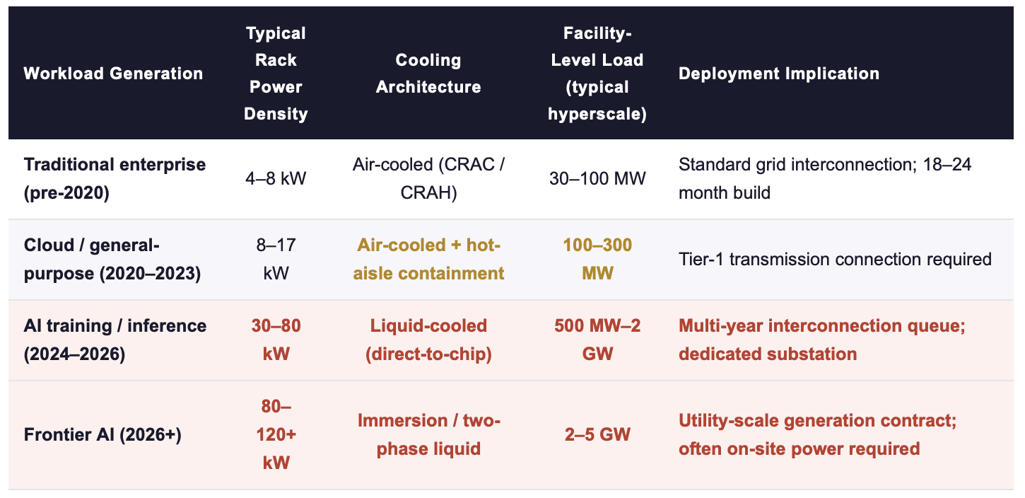• A single hyperscale AI campus now demands 1–5 GW of firm, continuous power, equivalent to the load of several hundred thousand households or a mid-size industrial city. Rack power density has moved from 8–17 kW (traditional) to 30–120+ kW (AI training), compressing a full thermal and electrical redesign into a 24-month deployment window.