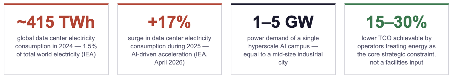 👉 Key Insight: The TCO spread between Scenario A and Scenario C on a hyperscale AI campus is not measured in percentage points of operating budget. On a 1 GW campus with a 10-year operating horizon, the spread is measured in billions of dollars of cumulative total cost, and in the strategic question of whether the AI product roadmap can be executed at all. Energy-system thinking is no longer an efficiency optimisation. It is the capital strategy.