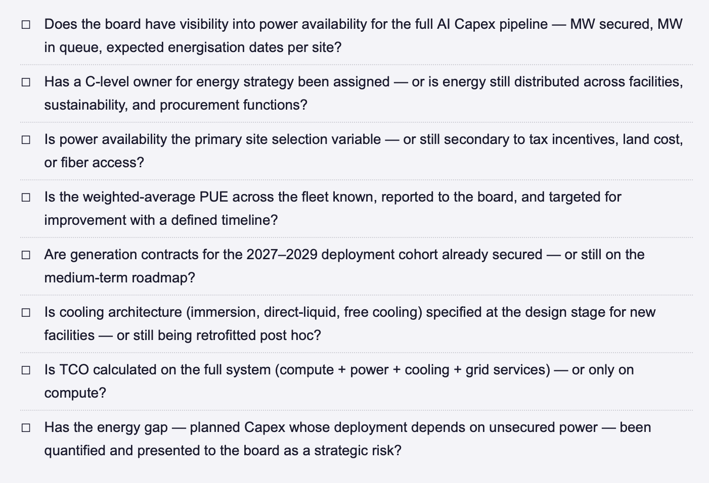 • Identify the energy gap: the volume of planned AI Capex whose deployment depends on power that is not yet secured. This is the single most important number for executive briefing in 2026, and it is usually unknown inside the organisation.