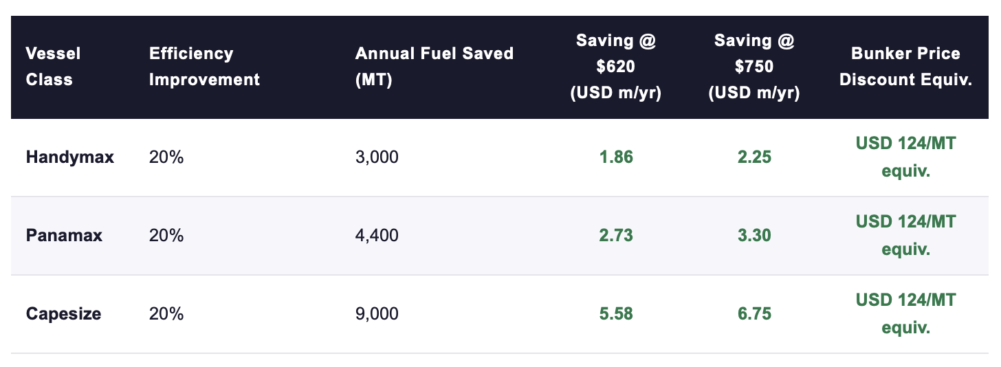 A 20% physical efficiency improvement, achievable today via proven drydock packages, delivers the equivalent of a permanent USD 100–150/MT bunker price discount, without counterparty risk, without commodity price dependency, and without infrastructure preconditions.